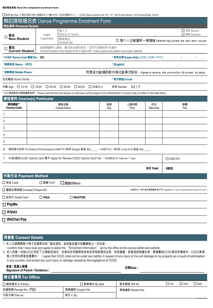 - 郵寄:連同劃線支票(支票抬頭“城市當代舞蹈團有限公司”;支票背面寫上學員姓名及聯絡電話),寄回大埔安邦路12號大埔藝術中心1樓101室CCDC舞蹈中心。請勿郵寄現金。若因郵遞錯誤,本中心恕不負責。(如支票書寫款項不自動減費,則當作自動放棄折扣優惠權利,中心將不退回多付款項,敬請留意。)